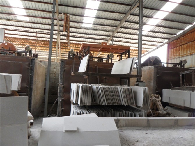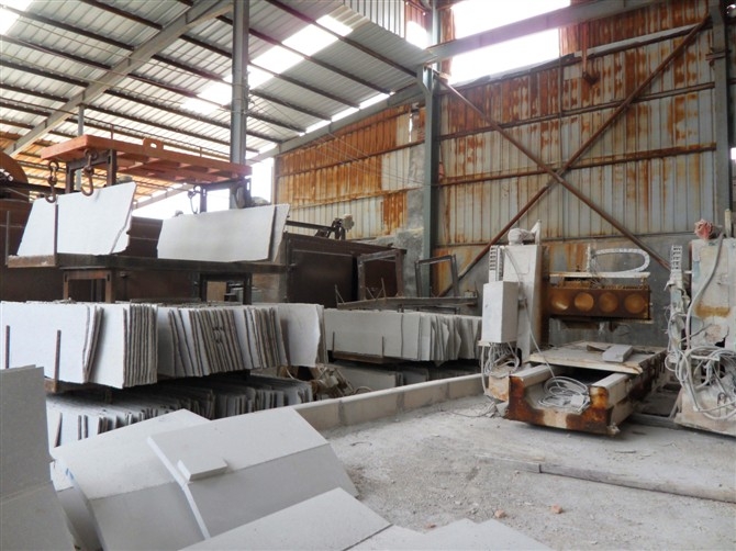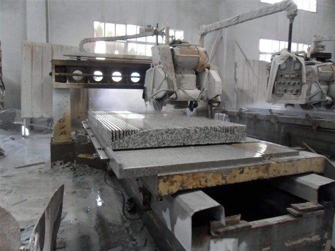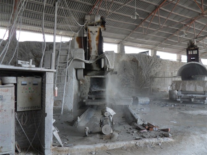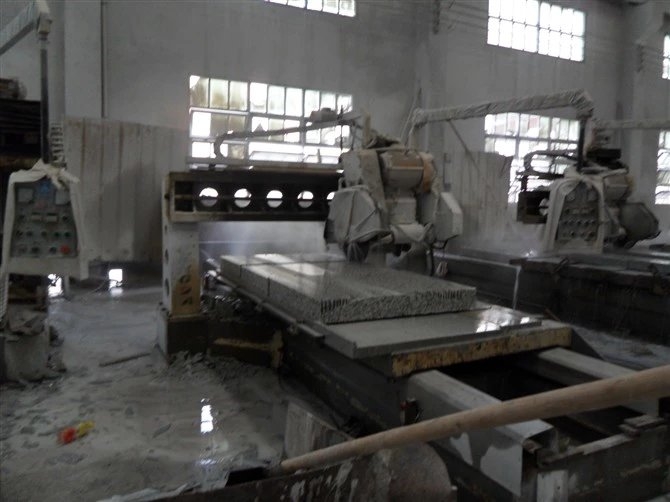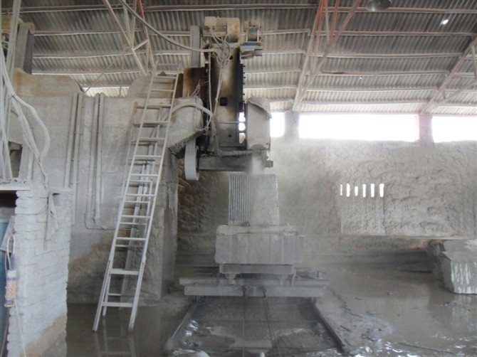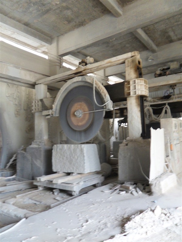 2、鋸割加工(荒料加工)。開采出來的大石塊叫做荒料,一般是用金剛石圓盤鋸進(jìn)行鋸解加工成石板,對于大理石,則還可以用金剛砂鋸進(jìn)行加工。金剛石圓盤鋸使用一個(gè)大的圓盤形鋸片,鋸片上鑲嵌有粉末冶金粘接的金剛石顆粒。這種設(shè)備可以加工硬質(zhì)石材,使用也比較靈活,缺點(diǎn)是圓盤的直徑需要二倍的石材高度加上法蘭盤直徑,而太大的鋸片直徑制造不易,因此不利于加工較大規(guī)格板材。金剛砂鋸是使用一排(多條)條狀鋸片,每條鋸片類似于木匠使用的手工鋸鋸條,但金剛砂鋸是多條平行排列,每條之間間隔與板材厚度相等,這樣砂鋸可以將整塊荒料一次性鋸解成很多片板材。但是金剛砂鋸由于使用金剛砂作磨料,不太適合加工硬質(zhì)的花崗巖,一般只用于加工大理石。另外,如果荒料中有缺陷,在加工前沒有被發(fā)現(xiàn)的話,由于金剛砂鋸加工是一次性完成,等到加工完發(fā)現(xiàn)缺陷就來不及了,將導(dǎo)致整塊荒料報(bào)廢,所花的加工費(fèi)也浪費(fèi)了,因此不適合缺陷較多的石材品種。鋸割加工中主要的加工設(shè)備是花崗石專用的框架式大型自動加砂鋸、多刀片雙向切機(jī)、多刀片電腦控制花崗石切機(jī)和花崗石圓盤鋸石機(jī)等。經(jīng)過鋸割的板材稱為毛板。