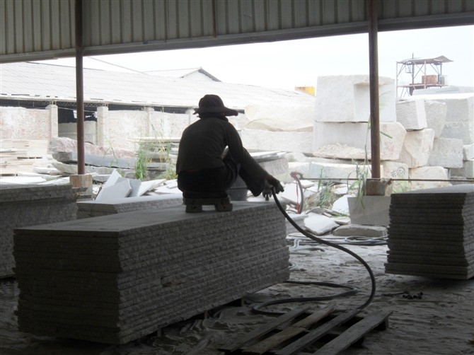 (17)噴沙(Sandblasted):用普通河沙或是金剛沙來代替高壓水來沖刷石材的表面,形成有平整的磨沙效果的裝飾面。