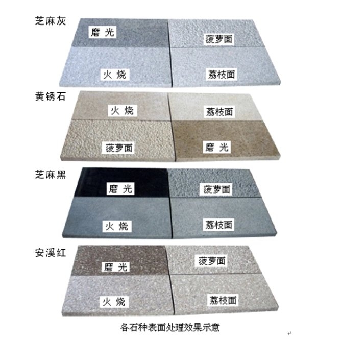 (1)拋光(Polished):表面非常的平滑,高度磨光,有鏡面效果,有高光澤?;◢弾r、大理和石灰石通常是拋光處理,并且需要不同的維護(hù)以保持其光澤。