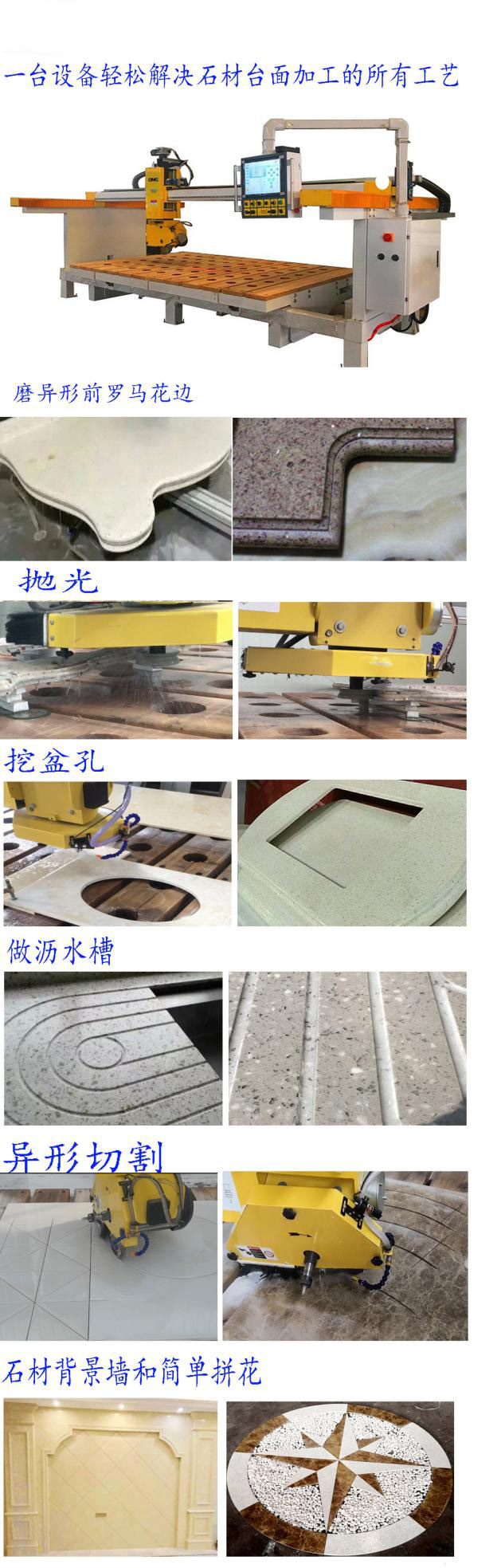 人造石可分為聚酯板類和復(fù)合亞克力類。聚酯板的主要原材料是不飽和聚酯樹脂、氫氧化鋁、碳酸鈣及天然原料,色澤柔和絢麗,光澤度高,具有足夠的強度、硬度,可切割加工各種不同規(guī)格、形狀的臺面,而且可以做到拼接無縫,表面光滑平順,石英石櫥柜臺面磨邊機,由底至面實心一體,無毛細孔,不藏污納垢,無細菌滋生、無輻射性,容易清理。聚酯板類人造石(不飽和樹脂+填充料)是為常用的人造石。復(fù)合亞克力類是一種復(fù)合而成的高分子產(chǎn)品,除了具有聚酯板類人造石的一切特點外,質(zhì)感更細膩,抗老化性能、硬度、光亮度和搞彎曲變形性能更優(yōu)異。優(yōu)點是容易造型,接駁無縫,容易拋光打磨,缺點是表面易磨損,全自動櫥柜臺面磨邊機,易滲色,易開裂。但是人造石的硬度就不及石英石了,大理石櫥柜臺面磨邊機,而且熔點也不能超過200攝氏度,所以要注意保養(yǎng),而且相對更容易被油污、色漬滲透。